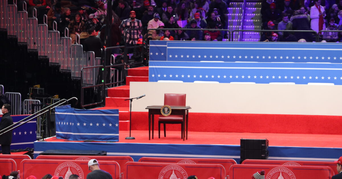 Sân khấu được thiết lập với bục phát biểu ở bên phải, ghế ngồi ở giữa phía sau bục phát biểu và một chiếc bàn nhỏ của Tổng thống ở bên trái sân khấu. Trump dự kiến ​​sẽ kư Sắc lệnh và đảo ngược các chính sách của Biden.