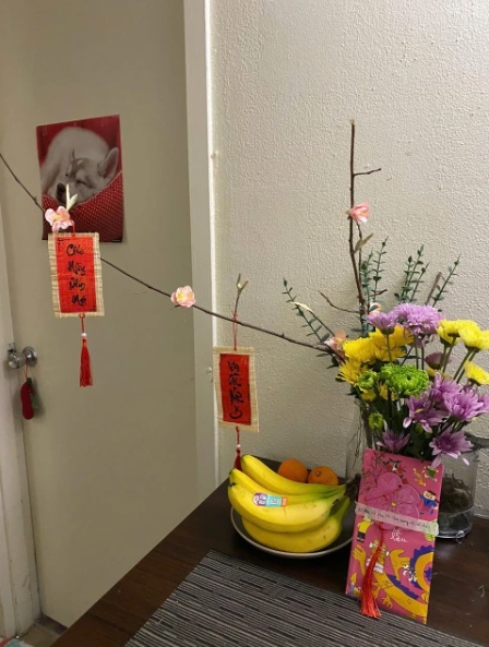 Nhớ năm ngoái, gần Tết, tôi đi kiếm vài cành cây khô và lọ mọ một buổi tối làm cành đào Tết. Cũng sửa soạn một bình hoa tươi, mâm hoa quả nhỏ và vài thứ quà bánh. Dù không được đủ đầy như ở nhà, nhưng đến giao thừa, tôi cũng thắp một nén nhang, hít hà, thấy mùi Tết đây rồi!