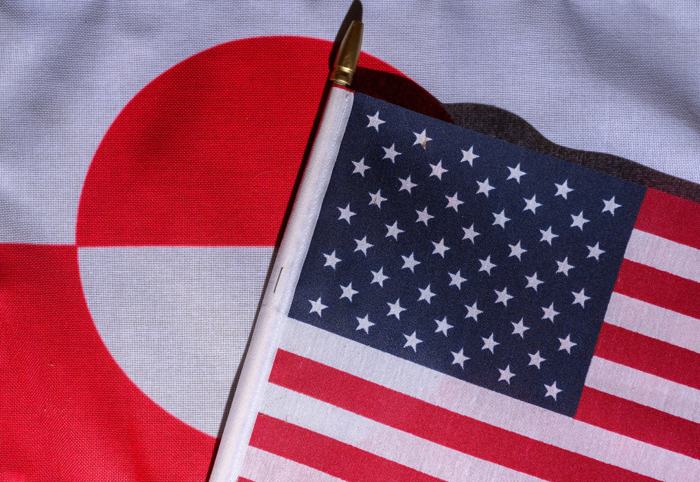 Cờ Mỹ (trước) và cờ đảo Greenland. Ảnh: AFP