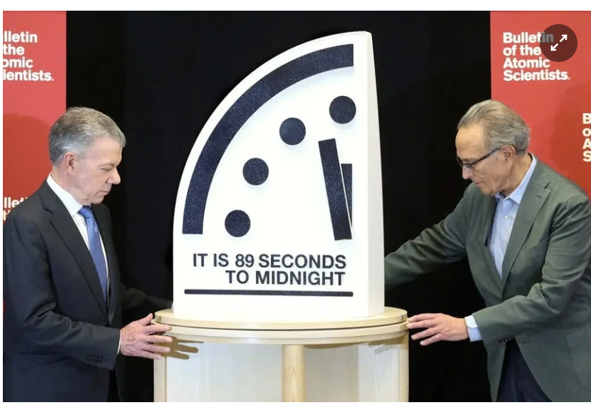 Tạp chí Bulletin of the Atomic Scientists (BAS), tổ chức phi lợi nhuận theo dõi và đánh giá mối nguy diệt vong của nhân loại kể từ năm 1947, ngày 28/1 (giờ địa phương) đã dịch chuyển kim tượng trưng của Đồng hồ Tận thế tiến thêm một giây, chỉ còn cách 89 giây so với mốc thảm họa.