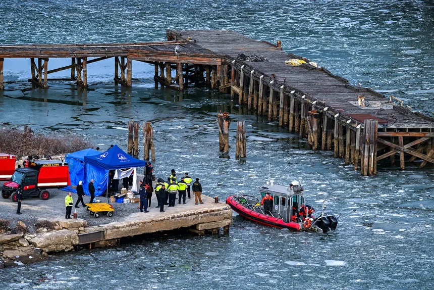 Các nhân viên cứu hộ gần hiện trường vụ tai nạn của trực thăng Black Hawk và máy bay của American Airlines. Ảnh: New York Times.