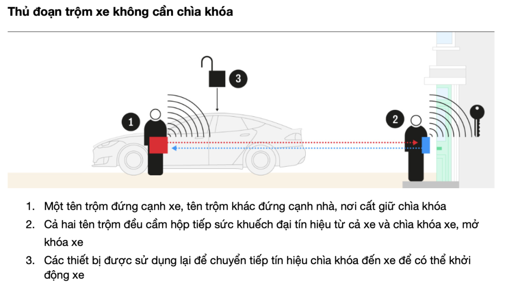 Thủ đoạn trộm cắp phổ biến nhất trong những năm gần đây là thông qua "rơle" và "bộ lặp". Nhóm trộm sử dụng chúng để chặn tín hiệu từ chìa khóa không cần chìa khóa và truyền đến một thiết bị khác dùng để mở xe.