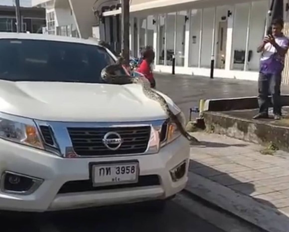 Con trăn khổng lồ trườn lên nắp ca-pô chiếc xe bán tải màu trắng khiến những người đi đường sửng sốt.