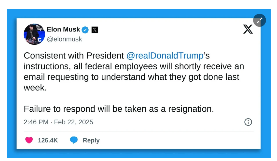 Tình hình hiện tại cho thấy, Musk và ông Trump không chỉ muốn yêu cầu nhân viên liên bang báo cáo công việc mà còn có kế hoạch sâu rộng hơn: cắt giảm nhân sự, thay thế công chức lâu năm bằng quan chức bổ nhiệm chính trị, xóa bỏ một số chính sách bảo vệ công chức, và chấm dứt các sáng kiến về đa dạng và hòa nhập.