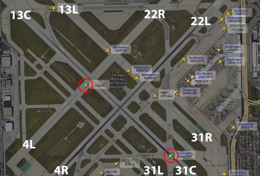 Chiếc Challenger 300 vẫn tiếp tục tiến vào 31C, trong khi phi cơ Southwest Airlines bắt đầu hạ cánh xuống đường băng này.