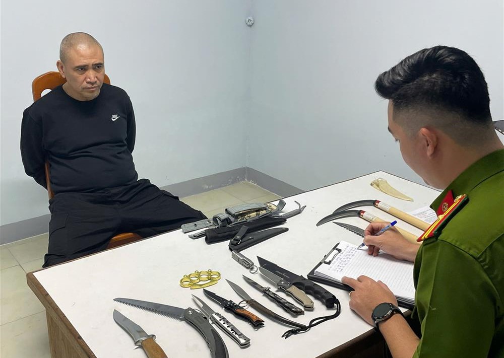 Trần Ngọc Anh cùng tang vật là nhiều loại hung khí, ma túy được cất dấu để sử dụng và phòng thân.
