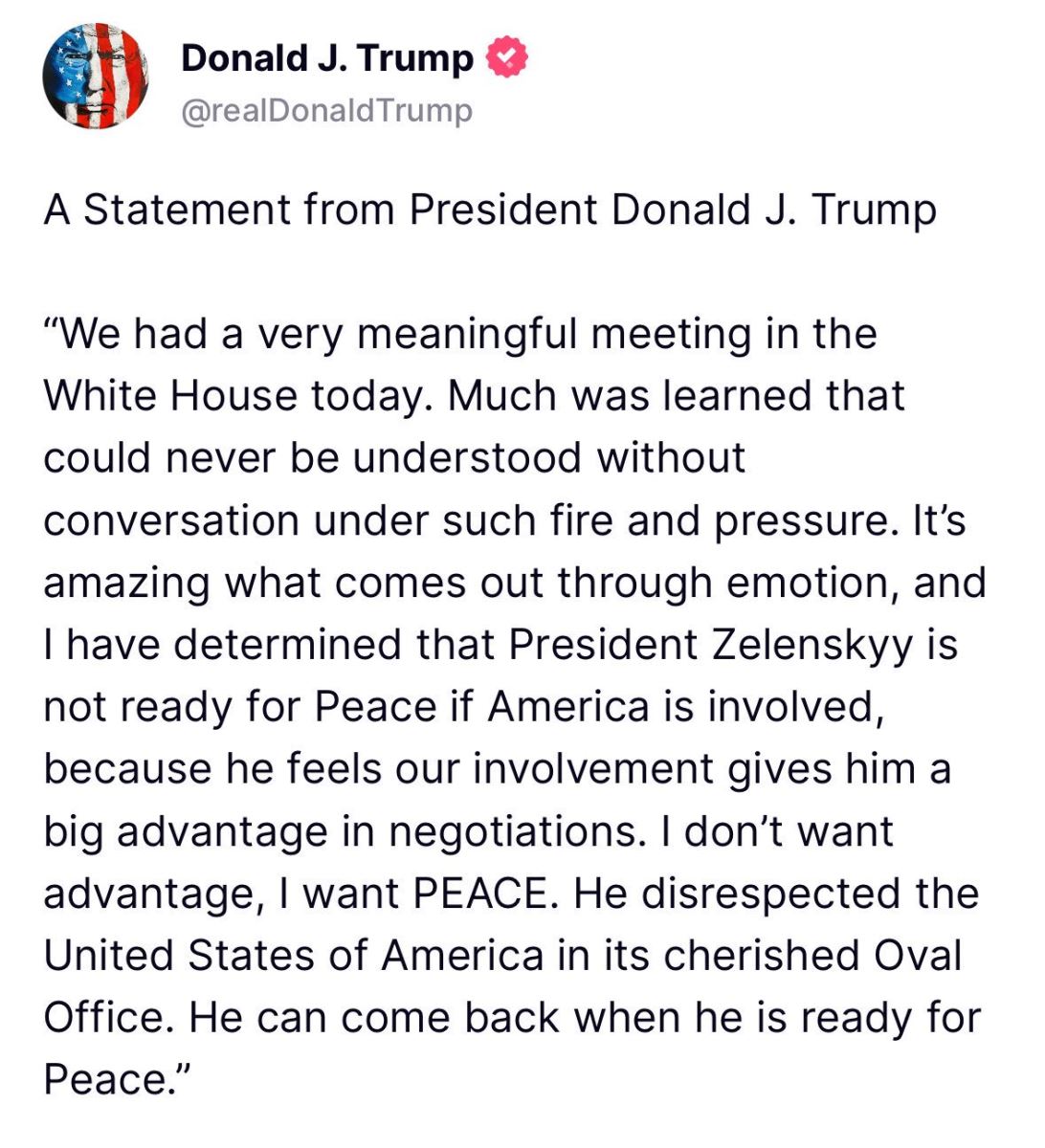 Cuộc họp báo dự kiến diễn ra sau cuộc gặp đã bị hủy bỏ và ông Trump đã đăng một tuyên bố trên nền tảng Truth Social vào sáng 1/3, nói rằng ông Zelensky chưa sẵn sàng cho hòa bình.