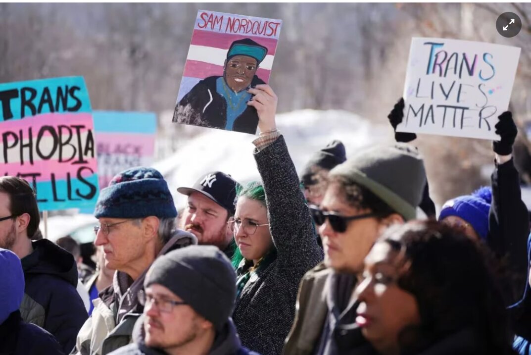 Một người giơ cao bức tranh vẽ Sam Nordquist trong buổi tuần hành ở Canandaigua vào ngày 22/2. Ảnh: USA Today.