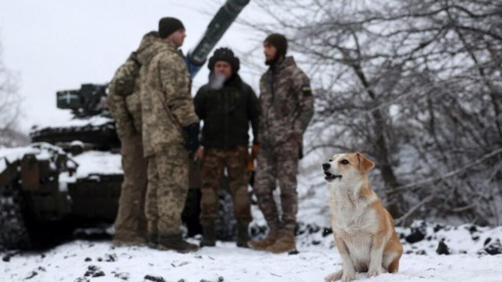 Ảnh tư liệu : Những người lính xe tăng Ukraina tại một vị trí gần Bakhmut, vùng Donetsk, Ukraina, cùng với chú chó trên tuyết. Ảnh chụp ngày 13/12/2023. AFP - ANATOLII STEPANOV