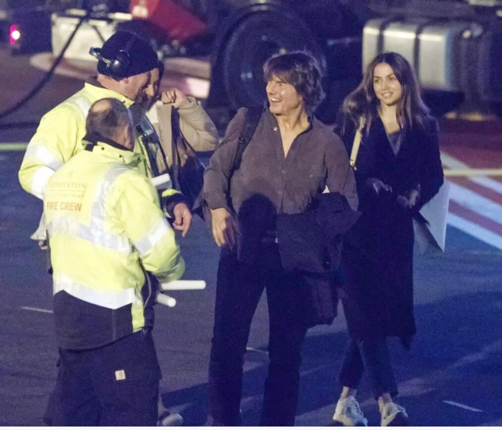 Cruise mặc áo sơ mi cài nút và quần jean đen, còn Ana de Armas giữ ấm cơ thể bằng chiếc áo khoác đen. Bộ đôi này cũng đã được nhìn thấy tại sân bay trực thăng London vào đêm hôm trước.