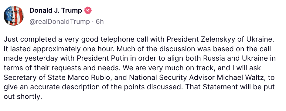 Thống báo của Tổng thống Mỹ Donald Trump về cuộc điện đàm với Tổng thống Ukraine Volodymyr Zelensky. Ảnh chụp tài khoản mạng xã hội Truth Social của Tổng thống Mỹ Donald Trump