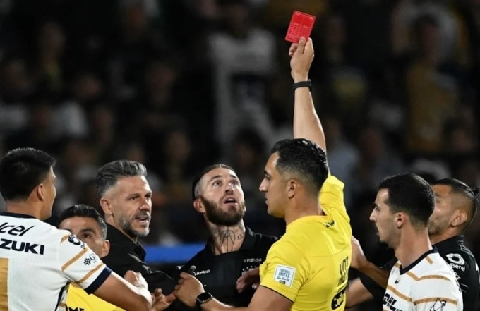 Ramos (giữa) nhận thẻ đỏ trong trận Monterrey thắng Unam 3-1 ở giải vô địch Mexico hôm 16/3. Ảnh: X