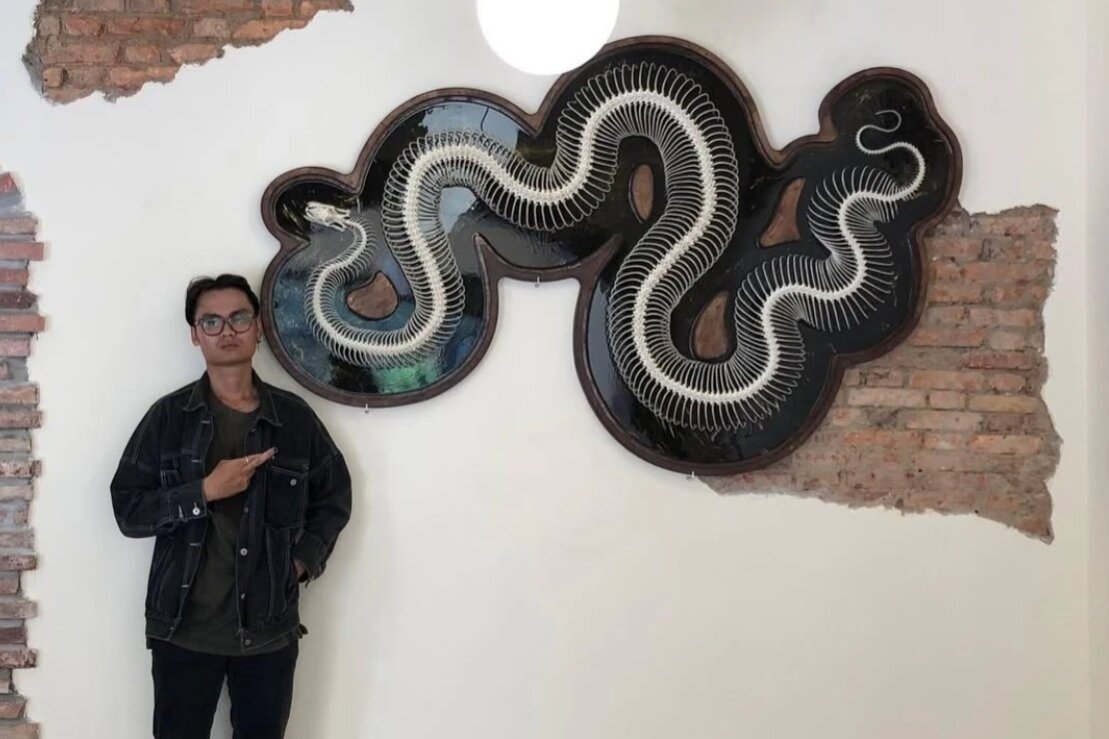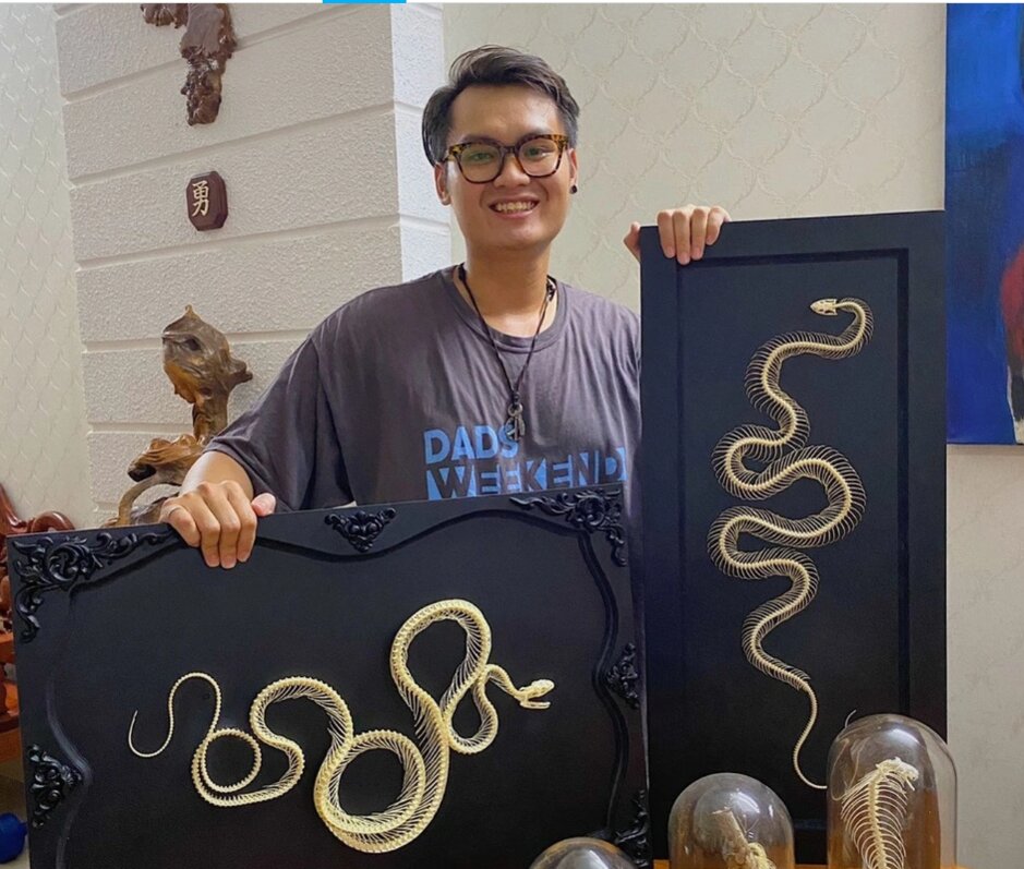 Tác phẩm có giá đắt nhất (35 triệu đồng) Quang Hiếu từng thực hiện là tiêu bản xương trăn gắn trên khung gỗ, được bán cho một tiệm tóc. Ảnh: @