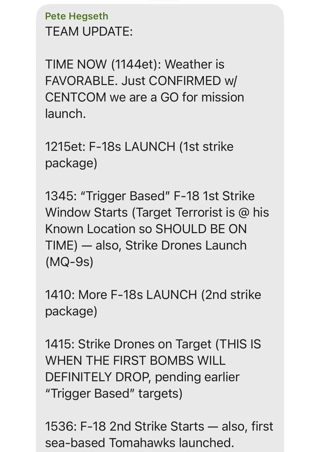 Các bức ảnh chụp màn hình của The Atlantic cho thấy, Bộ trưởng Quốc phòng Mỹ Pete Hegseth đã gửi lịch trình và các loại vũ khí được quân đội Mỹ dùng để tấn công Yemen vào ngày 15/3. Phó Tổng thống Mỹ J.D Vance đáp lại rằng, ông sẽ "cầu nguyện cho một chiến dịch thành công".