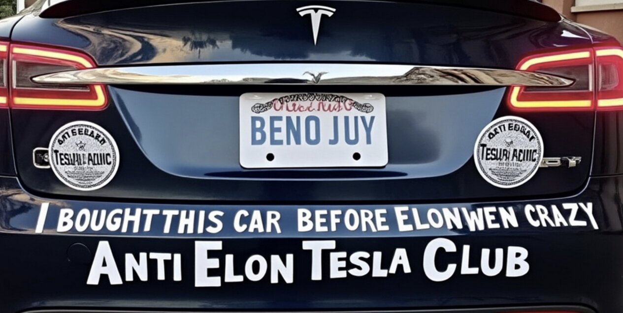 Một chủ xe dán dòng chữ: “Tôi mua xe này trước khi Elon phát điên”