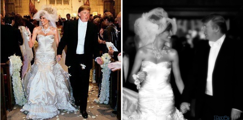 Chiếc váy cưới của Đệ nhất phu nhân Mỹ đến từ nhà mốt Christian Dior, do John Galliano thiết kế riêng cho hôn lễ của bà và Tổng thống Donald Trump ở Palm Beach, Florida, Mỹ, vào tháng 1/2005. Bà Melania cũng mặc chiếc váy cùng tấm mạng che mặt dài gần 5m khi trở thành gương mặt trang bìa cho ấn bản tháng 2/2005 của tạp chí Vogue.