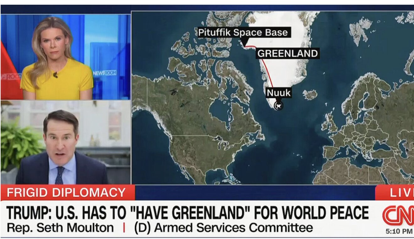 Hạ nghị sĩ Mỹ Seth Moulton (dưới cùng bên trái) suy đoán về tham vọng lãnh thổ của Tổng thống Donald Trump trên kênh CNN. Ảnh chụp màn hình chương trình CNN Newsroom