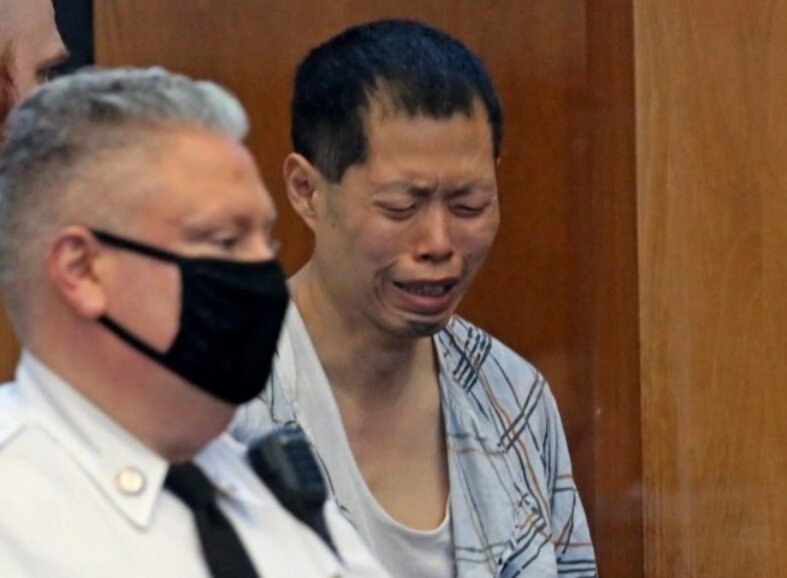 Tiết Thành Hải khóc nức nở trong phiên điều trần vụ giết người, ngày 8/4/2022. Ảnh: Boston Herald