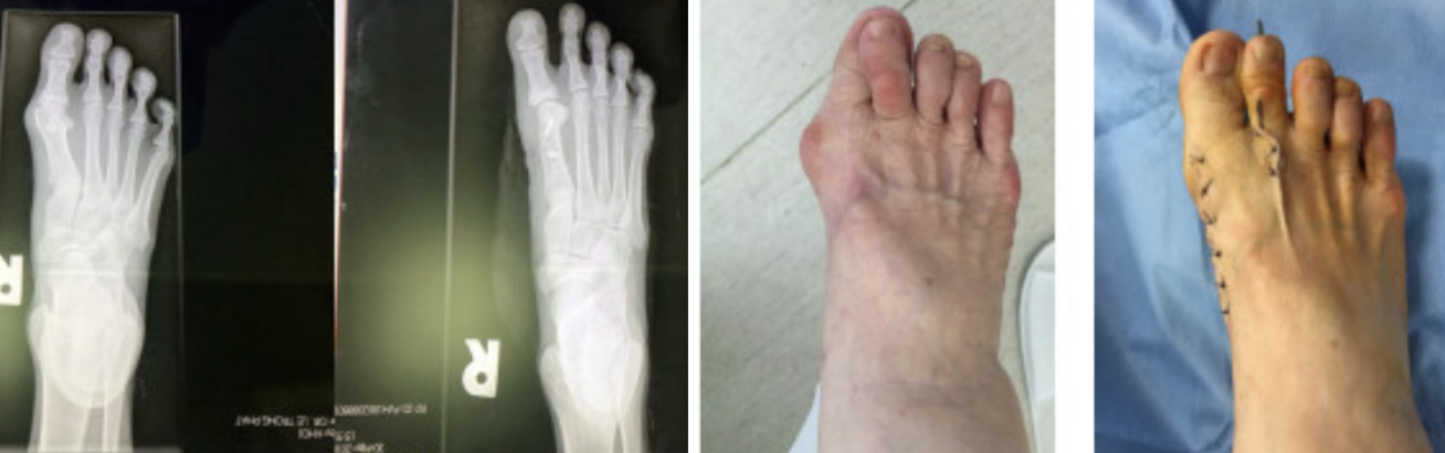 Ngón chân cái vẹo (ảnh chụp trước và sau phẫu thuật).