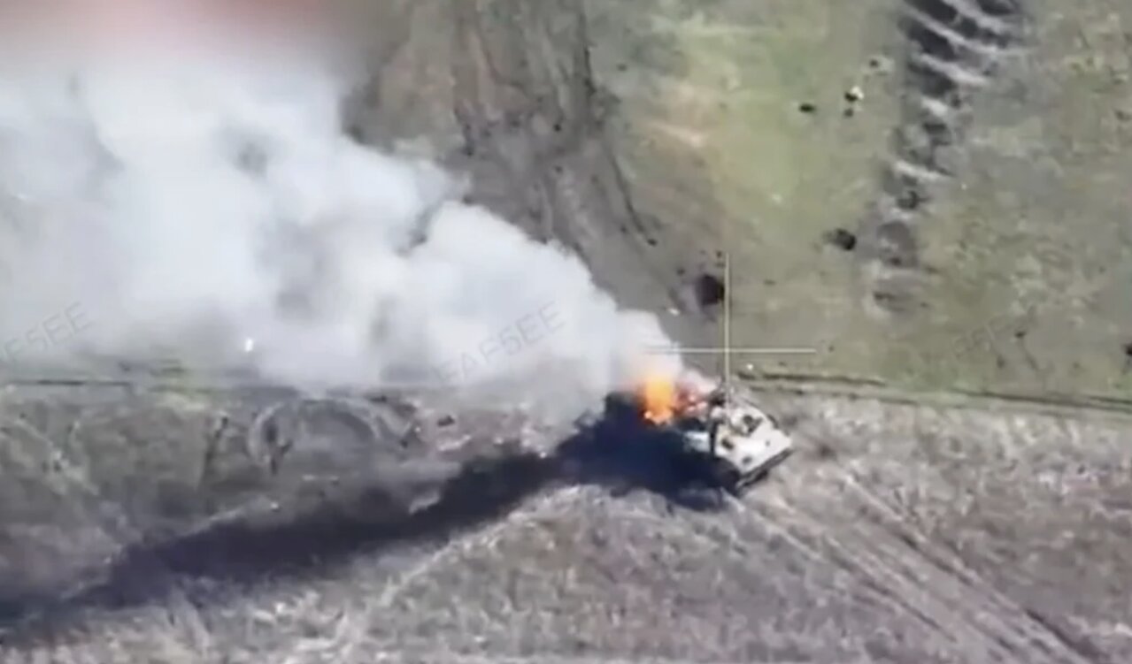 Ảnh cắt từ video do Lữ đoàn đổ bộ đường không riêng biệt số 80 của Ukraine đăng tải cho thấy một chiếc xe tăng của Nga bị UAV Ukraine tấn công và đang bốc cháy dữ dội ở Kursk.