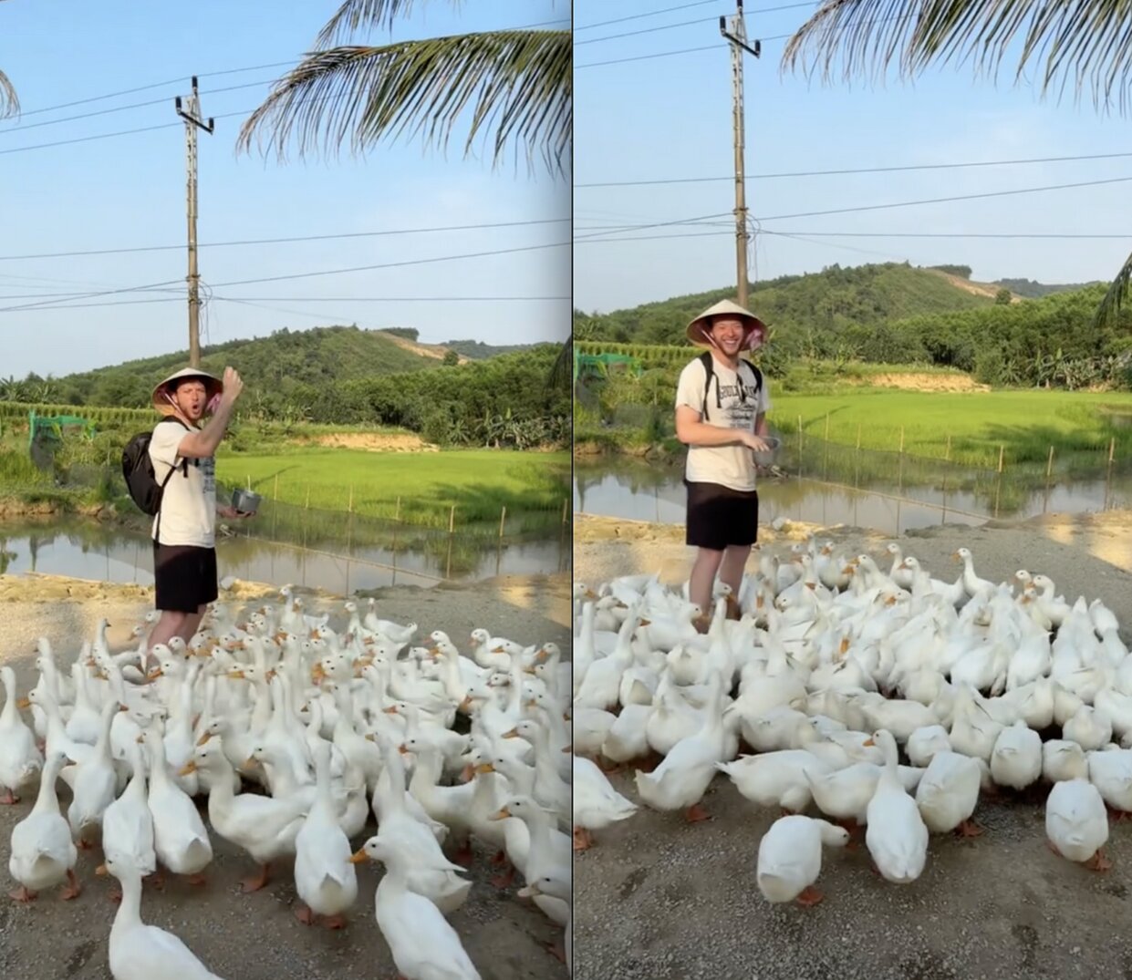 Mới đây, một đoạn clip ghi lại khoảnh khắc một vị khách Tây đang trải nghiệm một hình thức du lịch đặc biệt đã nhanh chóng khiến cộng đồng mạng bật cười thích thú. Trong video, vị khách được mời ngồi trên một chiếc ghế thấp, chân trần đặt hờ trên mặt đất, xung quanh là sân vườn rộng rãi, thoáng đãng với hàng trăm con vịt tung tăng chạy nhảy. Và trải nghiệm sau đó quả thật... "nhớ đời".