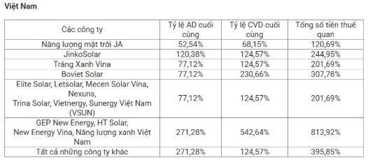 Tại Việt Nam, mức thuế trung bình là 395,9%, trong đó có 4 doanh nghiệp phải chịu tổng thuế suất lên đến 813,92% (gồm 542,64% thuế chống trợ cấp và 271,28% thuế chống bán phá giá).