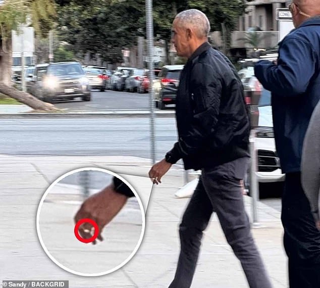 Ông Obama, 63 tuổi, diện áo khoác đen bên ngoài sơ mi cùng màu và quần dài màu xám đậm. Theo Mail, cựu tổng thống Mỹ đeo nhẫn cưới trong bối cảnh có nhiều đồn đoán về cuộc hôn nhân với bà Michelle.
