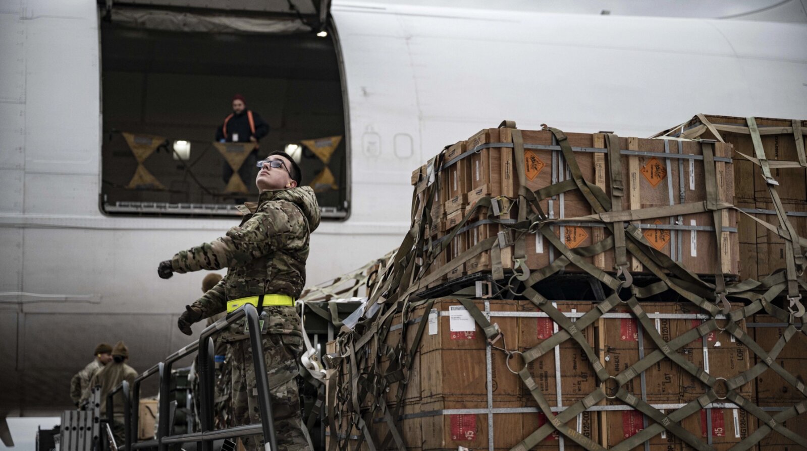 Hạ sĩ không quân Jonathan Miskelley, nhân viên vận hành khu vực bốc xếp của Phi đội Cảng hàng không 436, đang bốc dỡ hàng hóa trong một nhiệm vụ hỗ trợ an ninh tại Căn cứ Không quân Dover, bang Delaware, ngày 13/1/2023. Ảnh: Không quân Mỹ