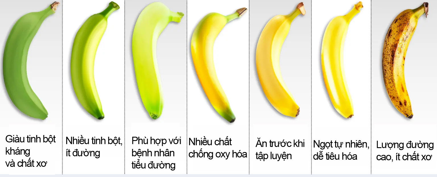 Dưới đây là 7 giai đoạn chín của chuối và đặc điểm dinh dưỡng tương ứng.