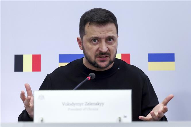 Tổng thống Ukraine Volodymyr Zelensky phát biểu trong cuộc họp báo.