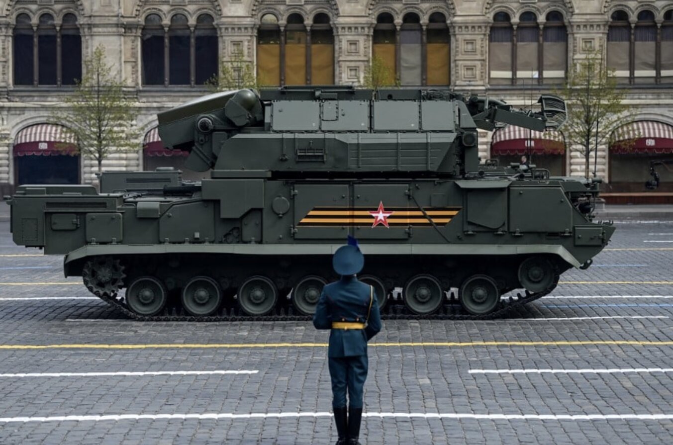 Hệ thống tên lửa đất đối không Tor-M2 của Nga diễu hành qua Quảng trường Đỏ trong lễ duyệt binh Ngày Chiến thắng ở trung tâm Moscow vào ngày 9 tháng 5 năm 2022.
