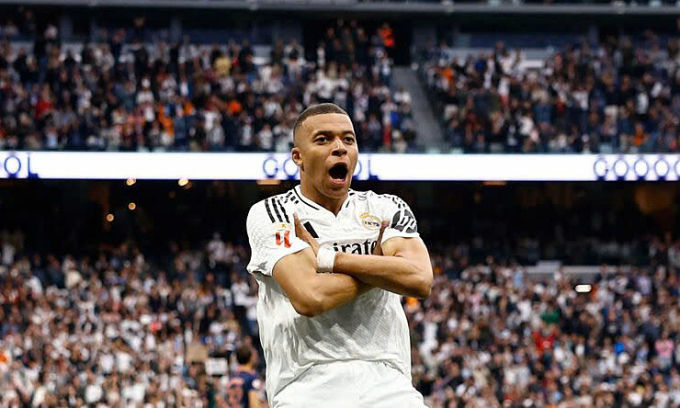 Mbappe mừng bàn trong trận Real thắng Celta Vigo tại La Liga, ngày 4/5/2025 trên sân Bernabeu, thành phố Madrid, Tây Ban Nha. Ảnh: Reuters
