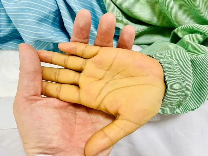 Bàn tay của bệnh nhân khi bị hôn mê gan do suy gan cấp tính, viêm gan virus B. (Ảnh: PV/Vietnam+)