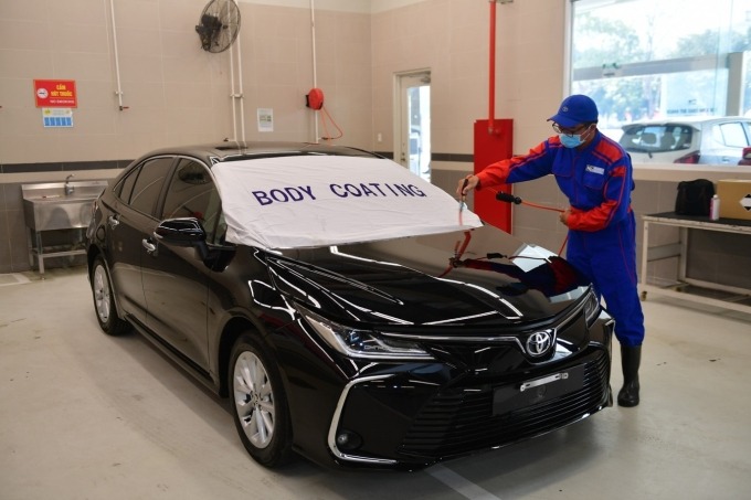 Nhân viên thực hiện vệ sinh và phủ bóng ngoại thất bằng sản phẩm chuyên dụng tại Toyota Hiroshima Tân Cảng. Ảnh: Capco