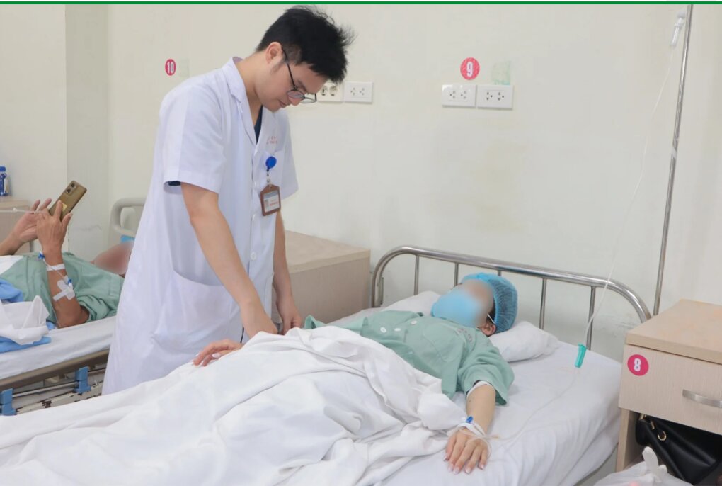 Đau bụng vì đau ruột thừa nhưng người bệnh lại tự ý dùng thuốc giảm đau, không đi viện, dẫn đến chậm trễ thăm khám, khiến tình trạng bệnh tiến triển nặng. (Bác sĩ thăm khám cho bệnh nhân sau phẫu thuật. Ảnh BVCC)