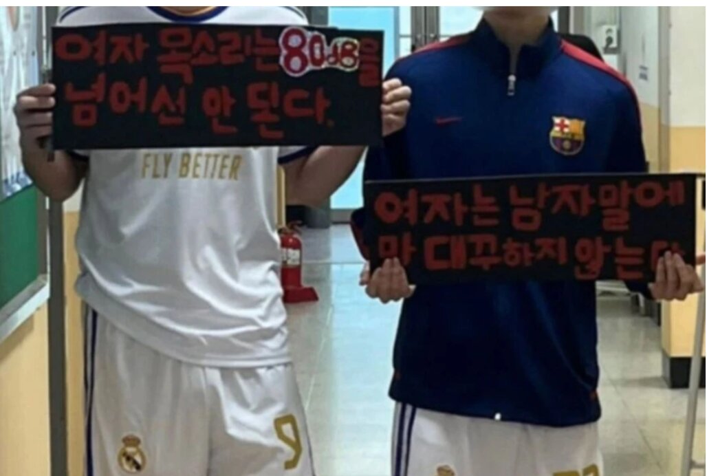 Ngày 16/5, hai nam sinh trung học tại thành phố Anyang, tỉnh Gyeonggi (Hàn Quốc), đã đăng tải hình ảnh lên mạng xã hội, trong đó họ cầm các tấm bảng ghi nội dung: “Phụ nữ không nên cãi lời đàn ông” và “Giọng phụ nữ không được vượt quá 80 decibel (dB)”. Hành động này nhanh chóng lan truyền và gây ra phản ứng dữ dội trong cộng đồng mạng, khi nhiều người cho rằng đây là biểu hiện rõ ràng của thái độ kỳ thị giới.