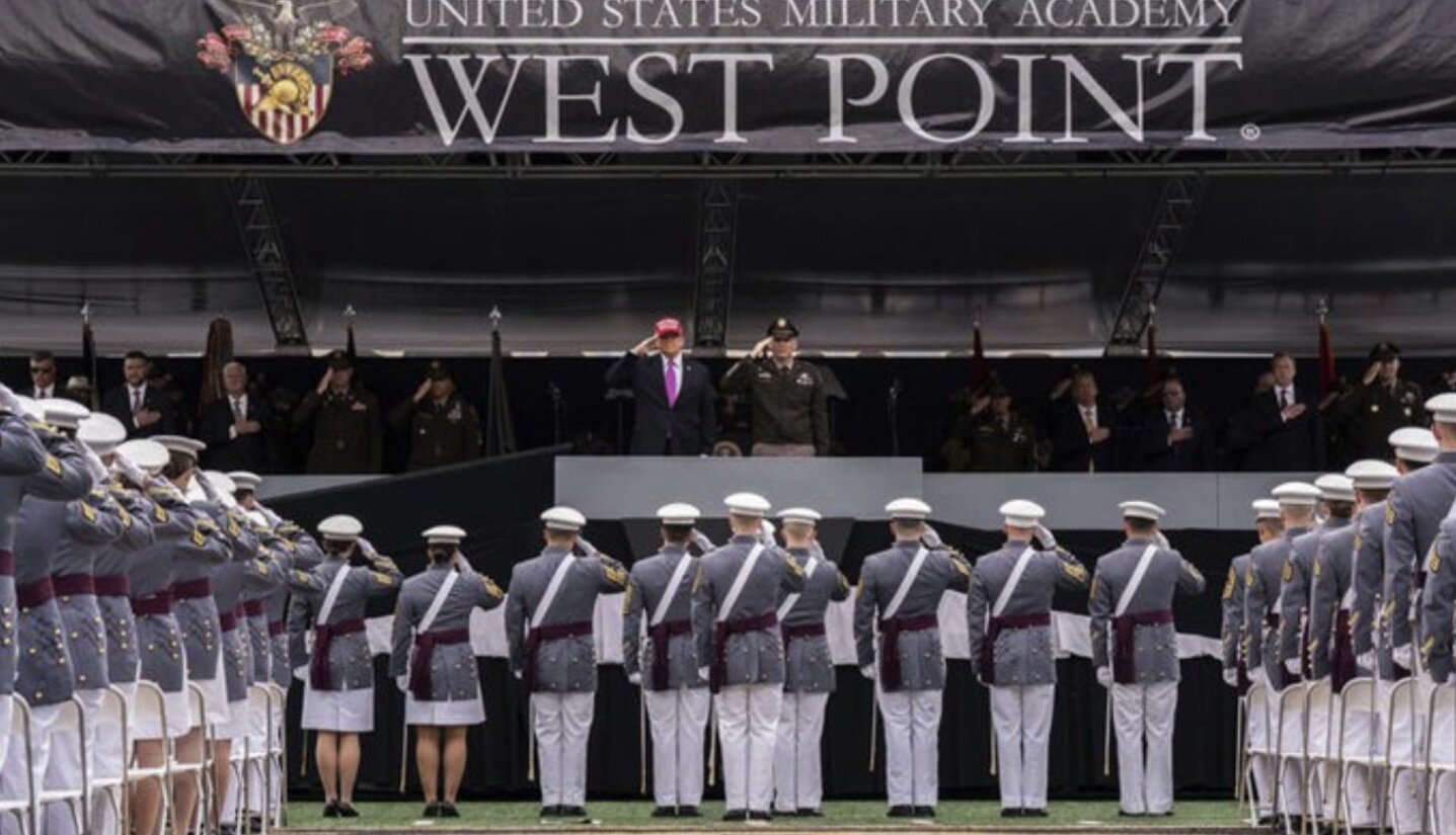 Tổng thống Donald Trump trong buổi lễ tốt nghiệp của Học viện Quân sự Mỹ tại West Point, New York ngày 24-5. Ảnh: AP