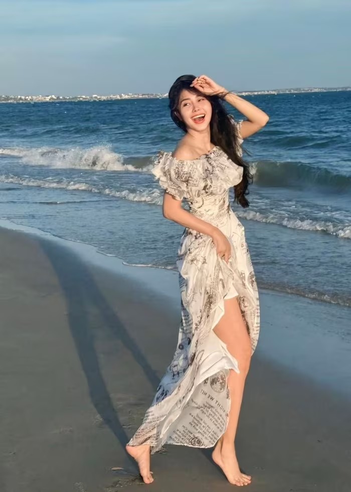 Tường Vi sở hữu võng lưng đẹp “mướt mắt”. Để khoe lợi thế hình thể này, cô chuộng trang phục cổ yếm hoặc hai dây. Ảnh: FB Tường Vi.