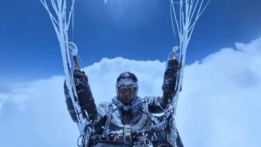Khoảnh khắc đáng sợ được ghi lại trên video cho thấy gương mặt và quần áo của ông Liu phủ đầy băng giá. Dù không mang mặt nạ dưỡng khí và bị tê cóng nghiêm trọng, người đàn ông vẫn giữ được tỉnh táo và tiếp tục điều khiển chiếc dù suốt thời gian bay.