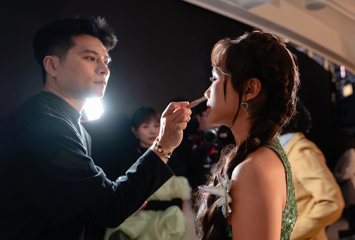 Phương Mỹ Chi chọn tông trang điểm nhẹ nhàng, tết tóc một bên.