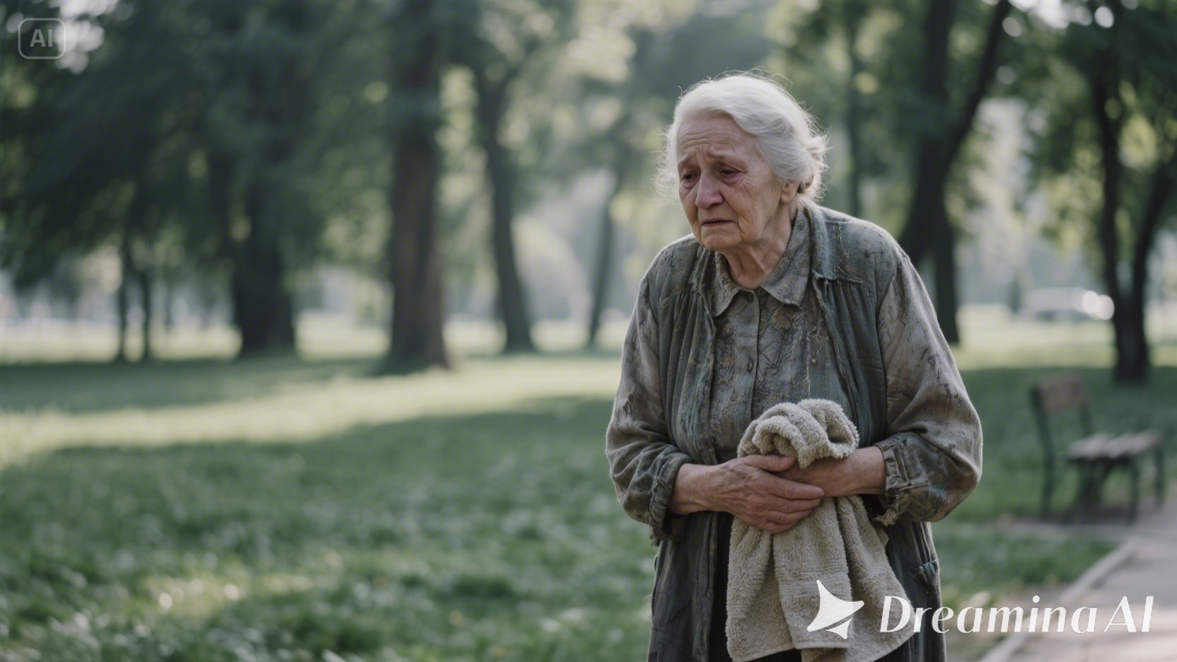 Một buổi sáng lạnh giá, người phụ nữ già bước chậm rãi qua công viên, tay cầm một chiếc khăn len cũ kỹ.