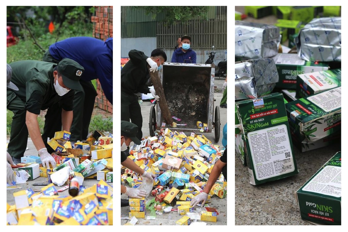 Ngay sau khi tiếp nhận thông tin, Công an Quảng Ninh phối hợp với Sở Y tế, Chi cục Quản lý thị trường và các đơn vị chức năng đã tổ chức kiểm tra, thu gom toàn bộ số hàng vào 13 xe rác để phân loại, kiểm đếm và xác minh.