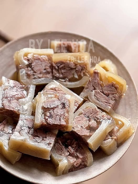 Thịt mềm, dằm nhuyễn. Xếp bên dưới là bì rồi thịt đã dằm, rắc thêm chút tiêu xay, xong đổ nước ninh trước đó vào và thêm một lớp bì ở trên.