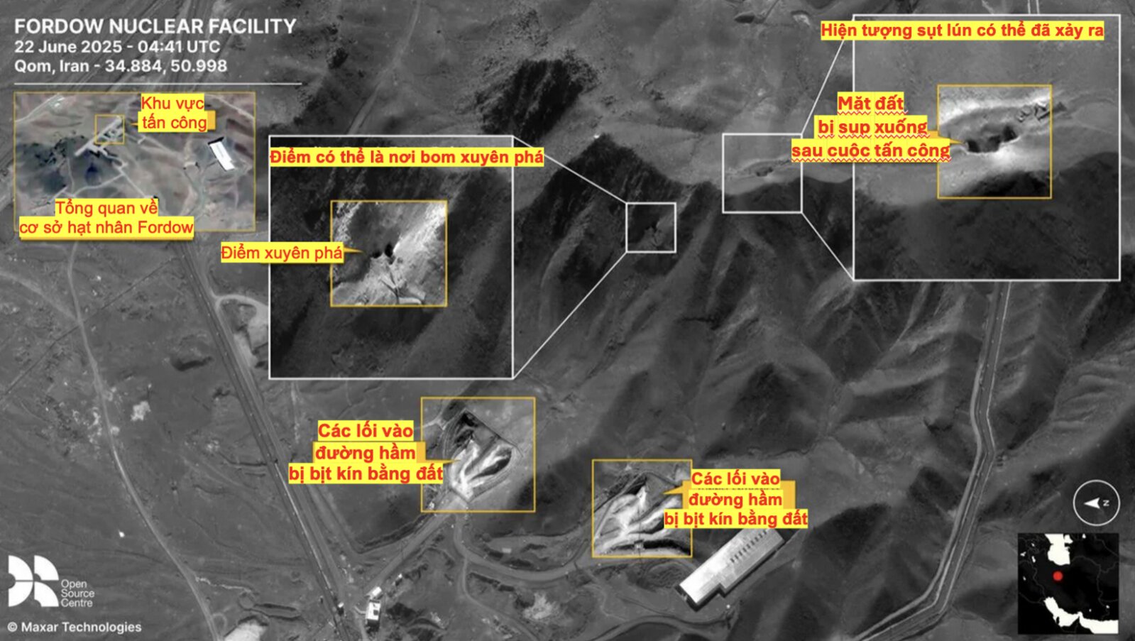 Hình ảnh vệ tinh của Maxar Tecnologies ngày 22/6/2025 cho thấy tại cơ sở hạt nhân Fordow có hai vị trí có thể là điểm bom xuyên phá. Ngoài ra, mặt đất đã bị sụp xuống sau cuộc không kích của Không quân Mỹ, trong khi các lối vào đường hầm bị bịt kín bằng đất. Ảnh: Maxar Tecnologies/NDTV