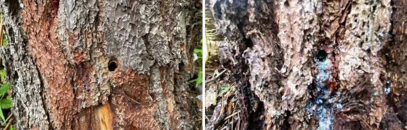 Thân cây thông già bị khoan lỗ, đổ dung dịch lạ vào bên trong để "đầu độc".