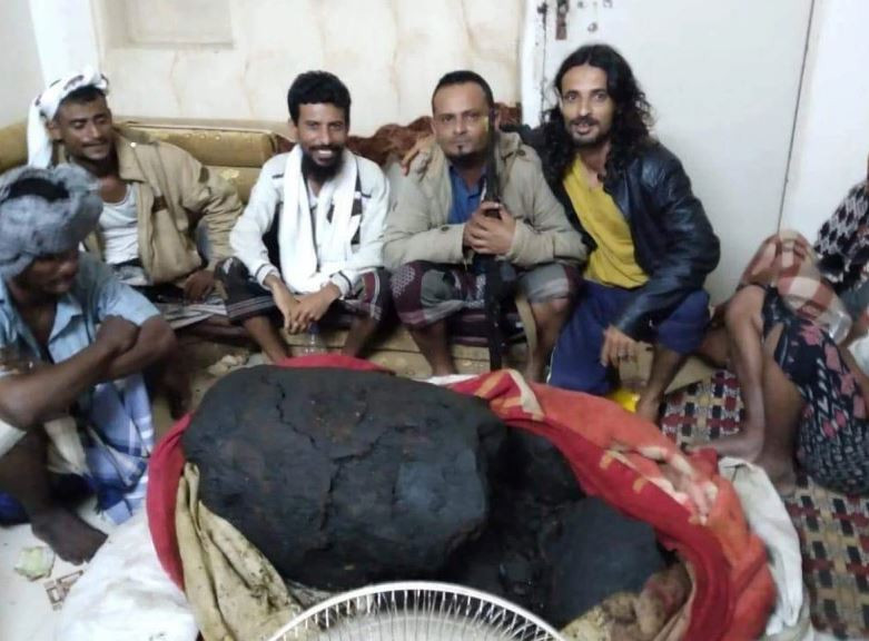Ngư dân Yemen và tảng long diên hương nặng 127kg mà họ tìm thấy trong một con cá nhà táng. Ảnh: middleeasteye.net