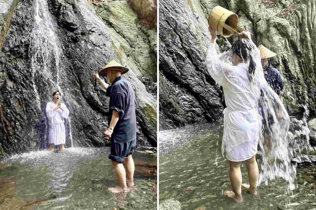 Sau khi cúi chào thần núi và thần thác, họ lần lượt đổ xô nước lên người, chắp tay và đứng dưới thác, dưới sự giám sát của nhà sư hướng dẫn.