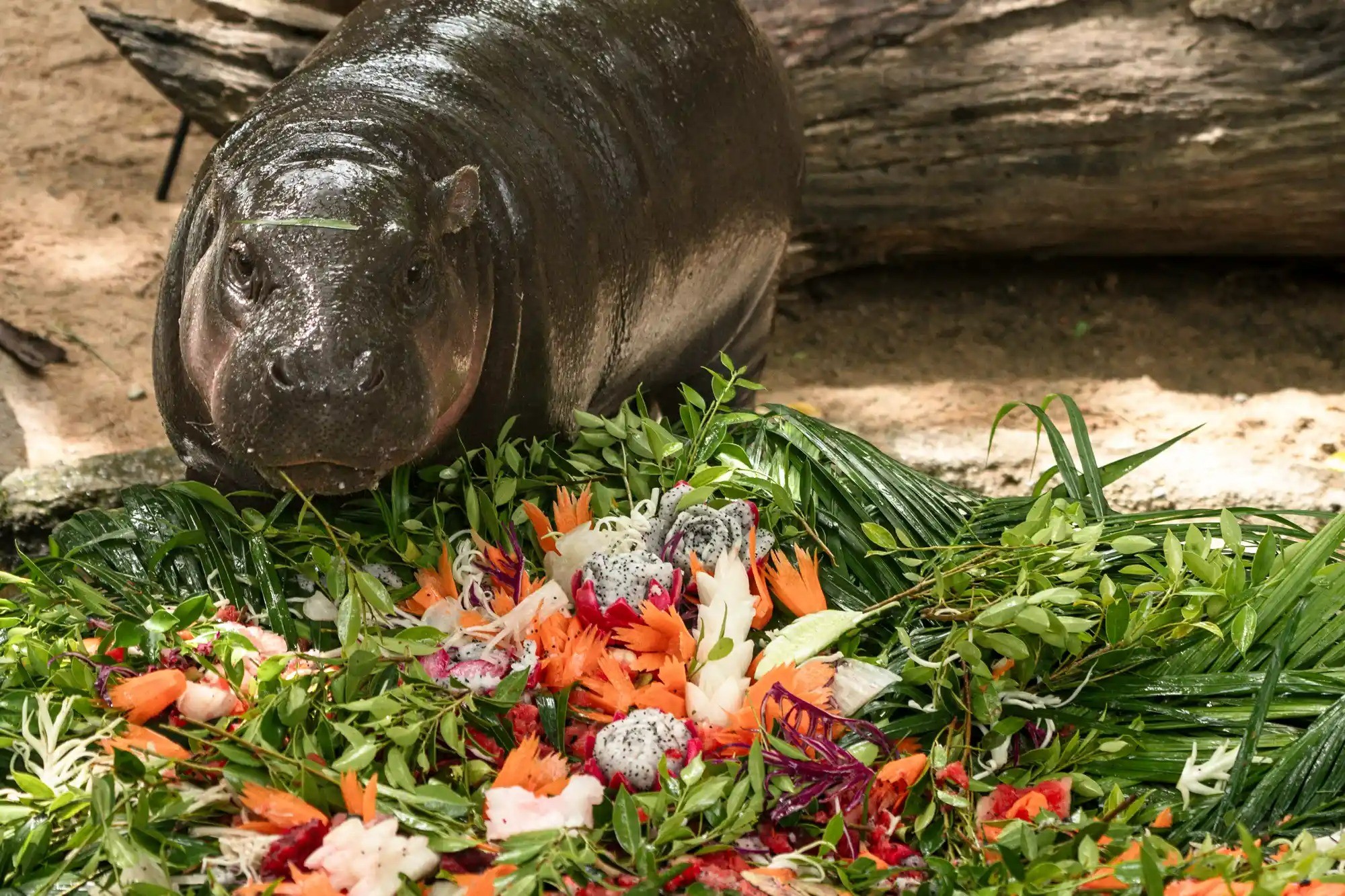 Moo Deng, cô hà mã lùn nổi tiếng của Vườn thú Khao Kheow, Thái Lan, vừa chính thức đón sinh nhật đầu đời với một sự kiện kéo dài 4 ngày, bánh sinh nhật nặng 20kg làm từ rau củ quả và hàng chục nghìn người đến chúc mừng.