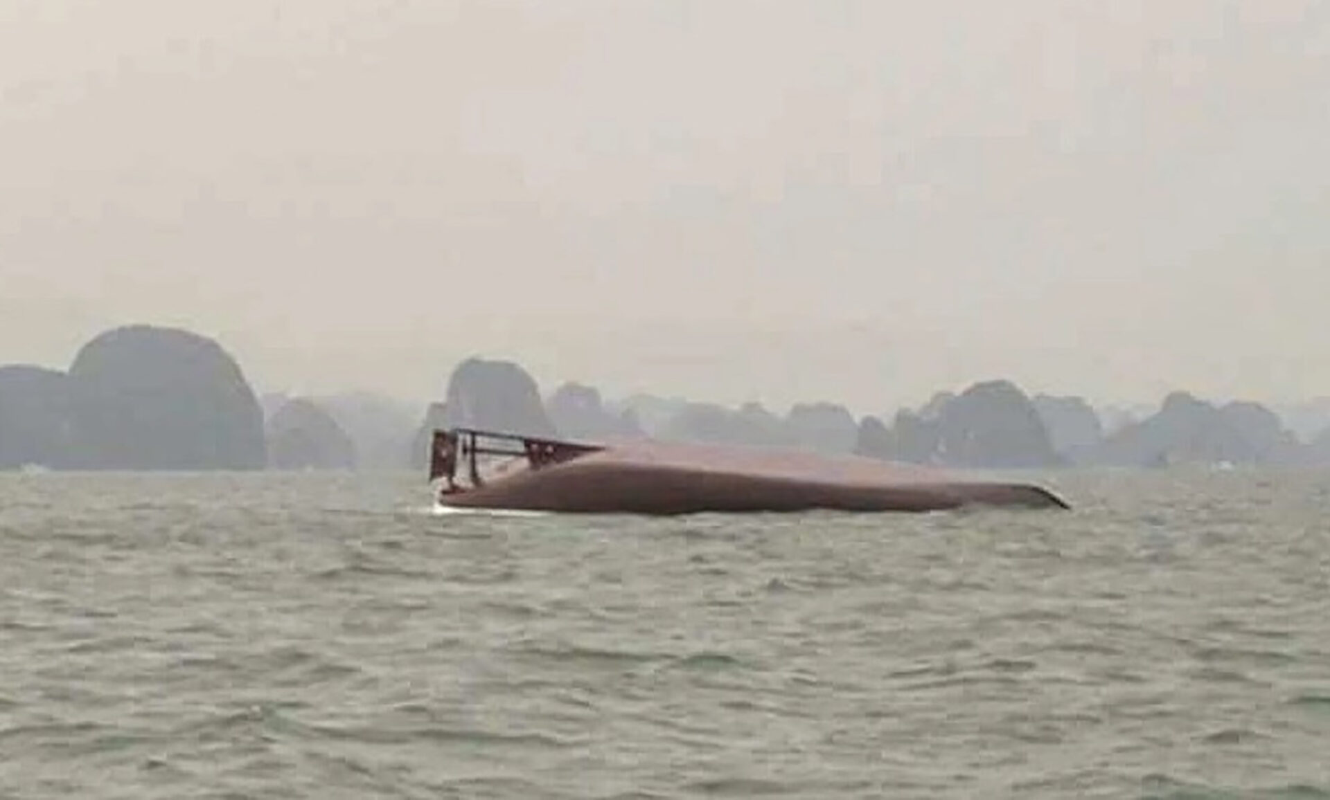 Hiện trường vụ tàu du lịch Wonder Sea bị gió bão đánh lật úp tại vịnh Hạ Long. (Ảnh: Xuân Hoa/VNExpress)
