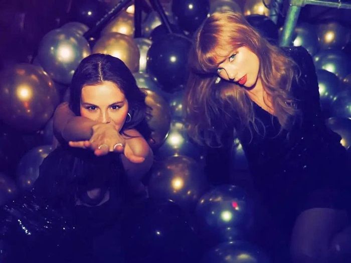Hai cô nàng thân thiết chụp ảnh tại căn phòng ngập tràn bóng bay. Giọng ca "Cruel Summer" diện một chiếc váy dài tay màu đen với son môi đỏ đặc trưng, trong khi Selena Gomez diện bộ jumpsuit đính sequin và áo khoác lông.